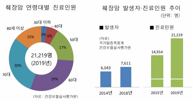 건강보험심사평가원 통계에 따르면 2019년 췌장암으로 건강보험 진료를 받은 2만1,219명의 연령대별 분포는 60대 이상이 74%를 차지하고 50대 17%, 40대 6%, 30대 이하 3%를 차지했다