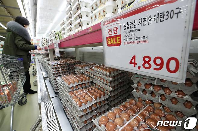 정부 비축 달걀을 판매하는 농협유통은 농협안심 자연란 대란 30구를 4,890원(일 100판 한정), 농협안심 자연란 특란 30구는 5,100원(일 300판 한정)으로 시중가보다 30% 이상 저렴한 가격으로 판매한다. 단 점포별 일 판매 물량은 다를 수 있다. 2021.1.28/뉴스1