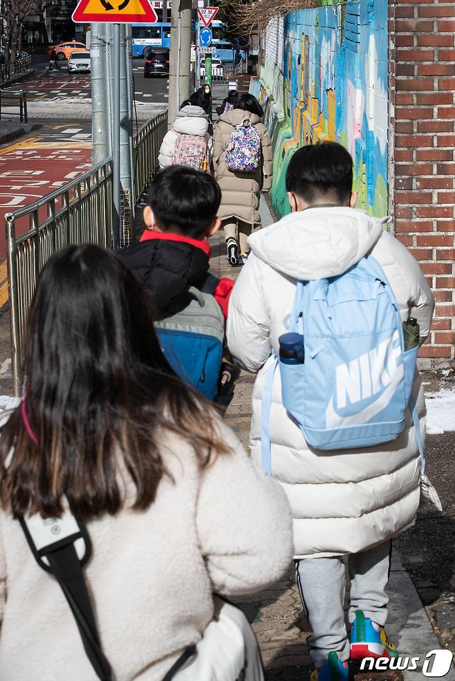 (서울=뉴스1) 유승관 기자 = 28일 서울시내 한 초등학교에서 학생들이 하교하고 있다.