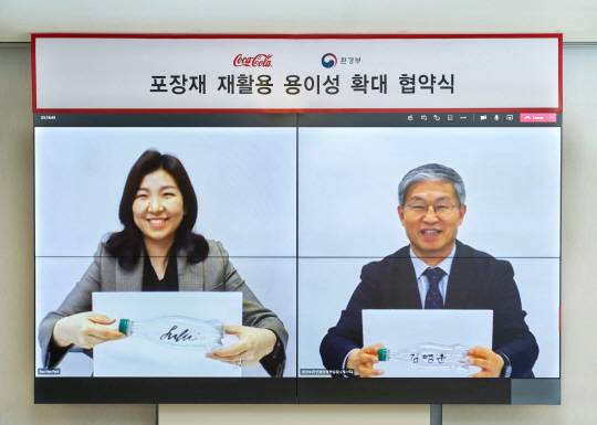 한국 코카콜라는 27일 환경부와 포장재 재활용 용이성 확대를 위한 업무협약을 체결했다고 28일 밝혔다. 최수정(사진 왼쪽) 한국 코카콜라 대표와 김영훈 환경부 자연환경정책실장이 언택트(Untact·비대면) 방식으로 협약식을 하고 있다.