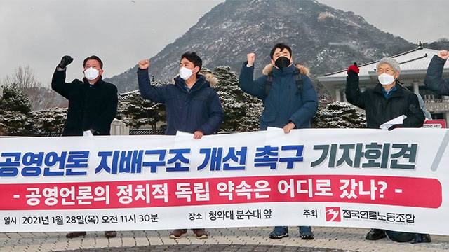 전국언론노동조합이 오늘(28일) 청와대 분수대 앞에서 기자회견을 열고 공영언론 지배구조 개선을 촉구했습니다.