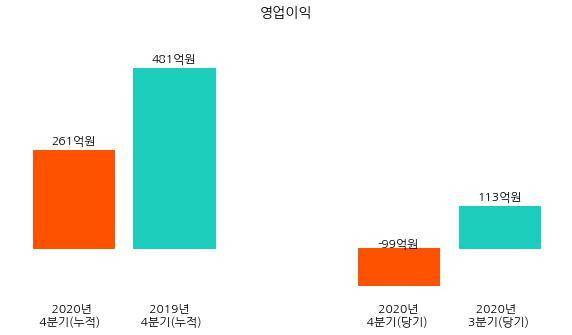 2020년 4분기 영업손실은 99억원으로 동년 3분기 영업이익 113억원 대비 212억원 감소해 적자로 전환됐다.