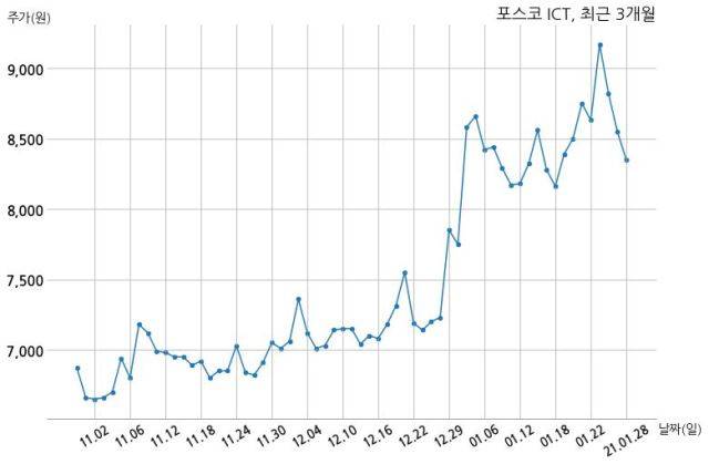 한편, 포스코 ICT의 15시 16분 현재주가는 8,350원으로 직전 거래일 대비 200원(-2.34%) 하락이며, 거래량은 2,091,665주이다.