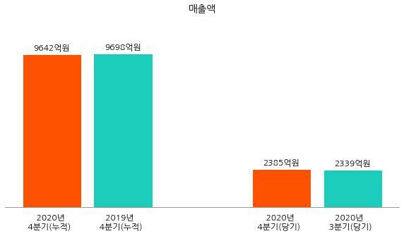 분기별 실적의 경우 2020년 4분기 매출액은 2385억원으로 동년 3분기 매출액 2339억원 대비 46억원(2.0%) 증가했다.