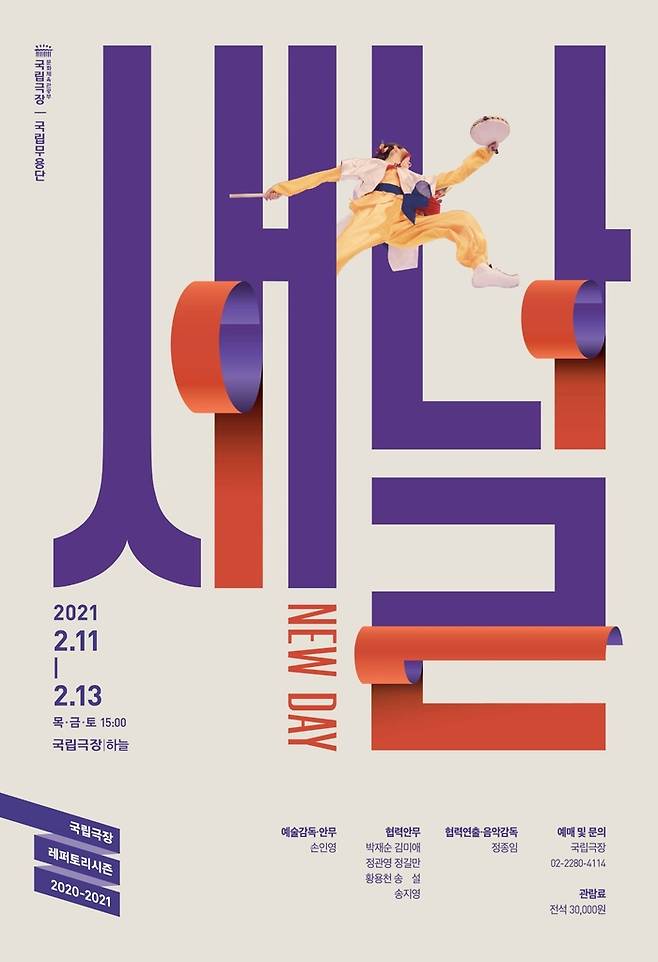 (서울=연합뉴스) 성도현 기자 = ▲ 국립무용단, 명절기획 시리즈 '새날' 공연 = 국립무용단이 설 연휴를 맞아 다음 달 11~13일 서울 중구 국립극장 하늘극장에서 '새날'을 공연한다. 손인영 예술감독이 안무를, 정종임 국악뮤지컬집단 타루 대표가 협력 연출을 맡는다.