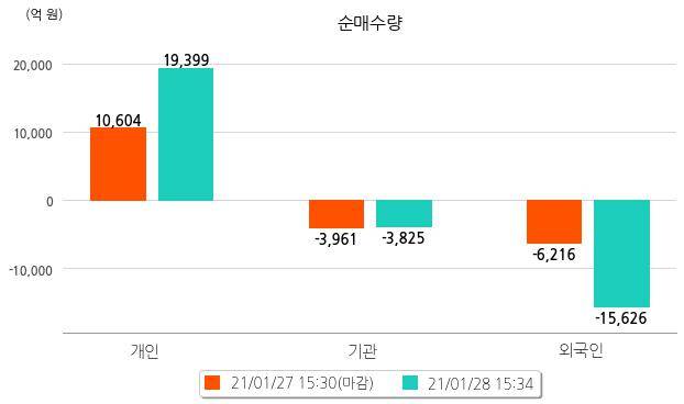 투자자별 동향을 살펴보면 기관은 3,825억원 순매도했으며, 외국인도 15,626억원 순매도했다.