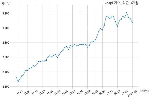 28일 코스피(3,069.05p, -53.51p, -1.71%)는 외국인 매도 우위 속에 전 거래일보다 -53.51p 하락한 3,069.05p로 장을 마감했다.