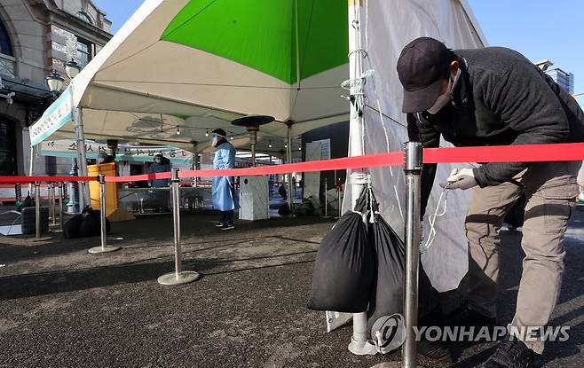 (서울=연합뉴스) 최재구 기자 = 눈이 그치고 바람이 강하게 분 28일 서울역 앞 중구 임시선별검사소에서 관계자가 모래주머니 등으로 선별검사소 시설물을 보강하고 있다. 2021.1.28