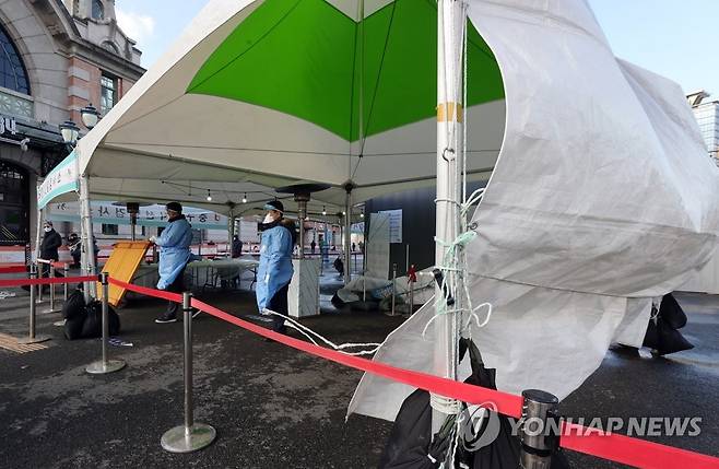 (서울=연합뉴스) 최재구 기자 = 눈이 그치고 바람이 강하게 분 28일 서울역 앞 중구 임시선별검사소 시설이 바람에 날리고 있다. 2021.1.28