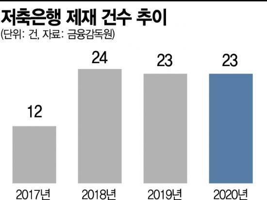 28일 금융당국에 따르면 지난해 모두 21개의 저축은행이 23건의 제재를 받은 것으로 파악됐다. 기관에 내려진 문책과 문책경고가 8건, 임원이 받은 주의ㆍ주의적경고(중복 포함) 등의 징계가 24건으로 나타났다. 2017년 12건에서 1년만에 제재 건수가 100% 증가한 후 매년 23~24건의 법 위반사항이 발생하고 있는 셈이다.