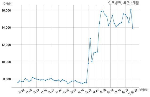 한편, 인포뱅크는 장 마감 이후 해당 기업공시를 발표했으며 오늘 종가가 13,900원, 거래량은 1,942,665주로, 직전 거래일 대비 2,200원(-13.66%) 하락했다.