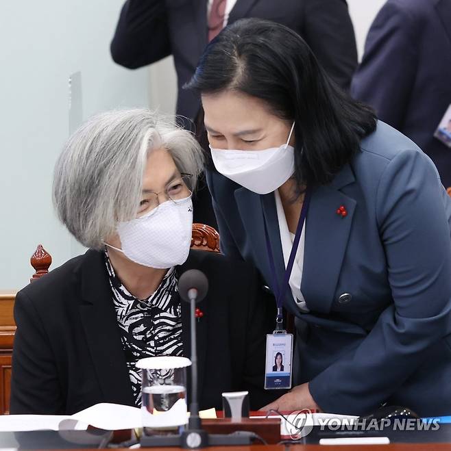(서울=연합뉴스) 이진욱 기자 = 강경화 외교부 장관(왼쪽)과 유명희 통상교섭본부장이 28일 오후 청와대에서 열린 한-우즈베키스탄 화상 정상회담에 참석해 있다. 2021.1.28