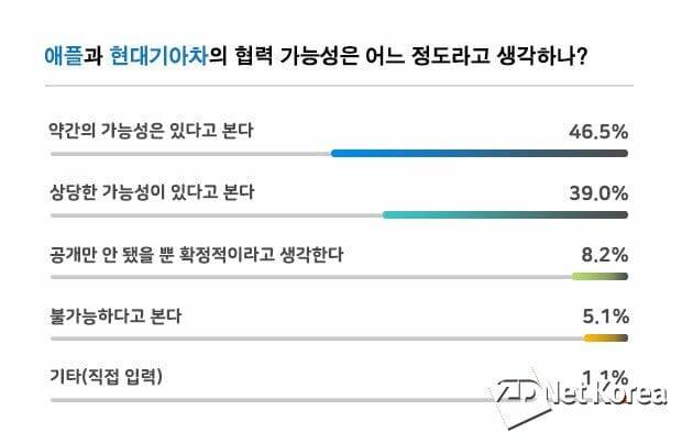 관련된 설문 결과 10명 중 8명은 “두 회사의 협업 가능성이 있다”고 봤고, 10명 중 6명은 “애플과 손을 잡을 경우 미래차를 준비하는 현대기아차에게도 도움이 될 것”으로 전망했다.