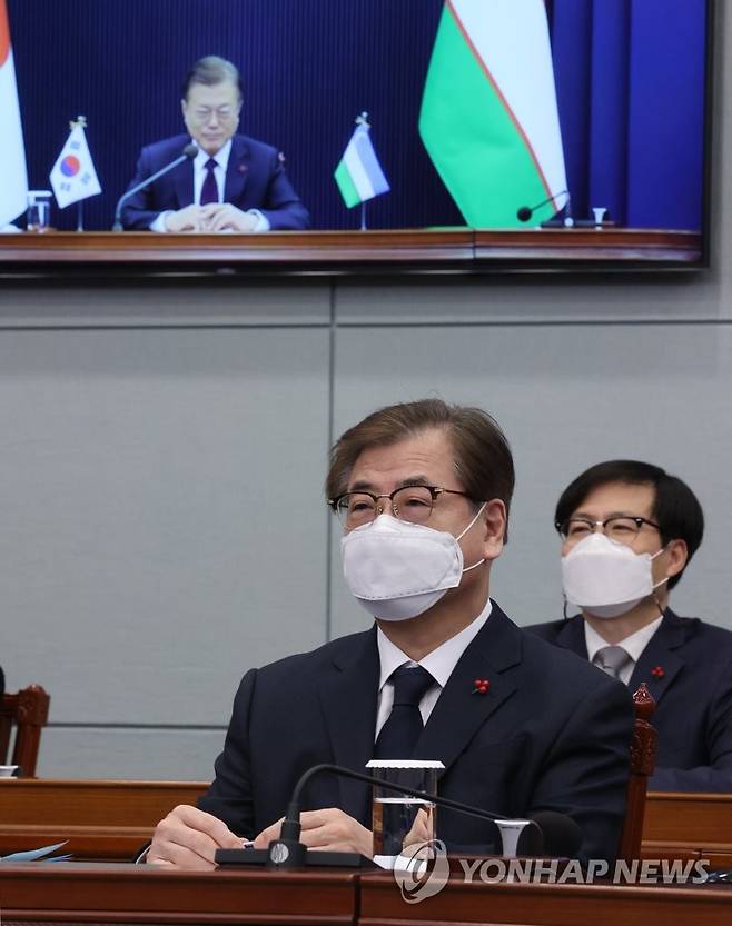 (서울=연합뉴스) 이진욱 기자 = 서훈 국가안보실장(아래)이 28일 오후 청와대에서 열린 한-우즈베키스탄 화상 정상회담에 참석해 있다. 2021.1.28