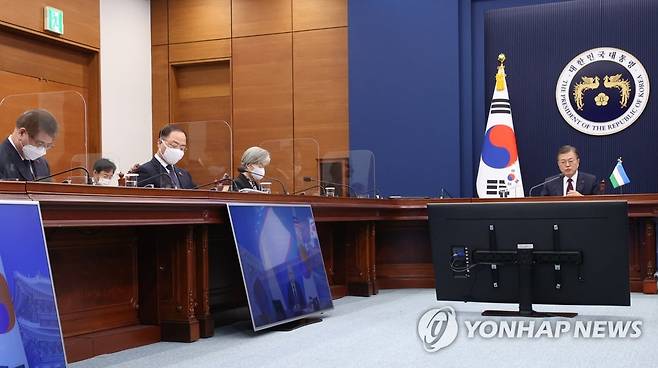 (서울=연합뉴스) 이진욱 기자 = 문재인 대통령이 28일 오후 청와대에서 열린 한-우즈베키스탄 화상 정상회담에서 인사말을 하고 있다. 2021.1.28