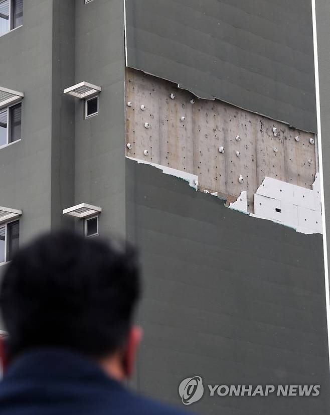 (강릉=연합뉴스) 이해용 기자 = 28일 낮 12시 40분께 강원 강릉시 안현동의 한 호텔 외벽이 심한 강풍에 의해 뜯겨 있다. 2021.1.28