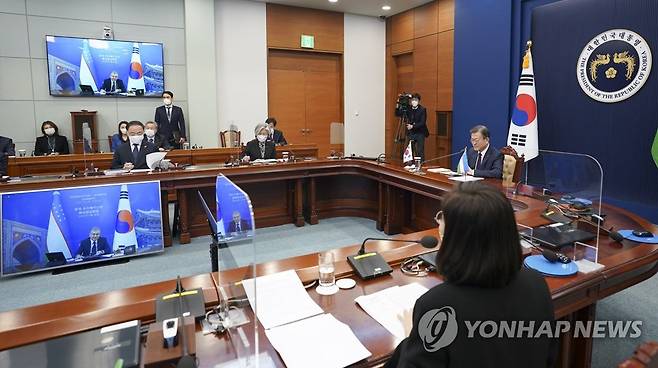 (서울=연합뉴스) 이진욱 기자 = 문재인 대통령이 28일 오후 청와대에서 열린 한-우즈베키스탄 화상 정상회담에서 샤프카트 미르지요예프 우즈베키스탄 대통령 인사말을 듣고 있다. 2021.1.28
