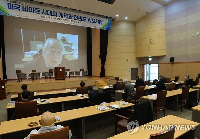 (춘천=연합뉴스) 양지웅 기자 = 28일 강원 춘천시 강원대학교 60주년 기념관에서 열린 '미국 바이든 시대 개막과 한반도 심포지엄'에서 문정인 대통령 통일외교안보특보가 화상으로 기조연설을 하고 있다. 2021.1.28