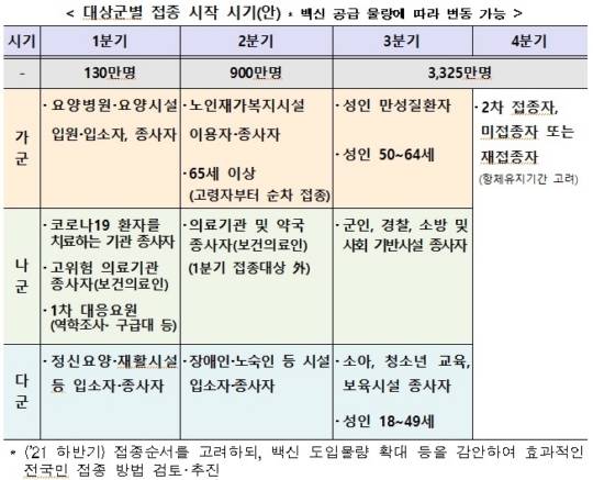이어 집단감염에 취약하고 감염시 치명률이 높은 고령자 집단시설 및 정신요양·재활시설 입원·입소자·종사자도 1분기 안에 접종을 시작한다.