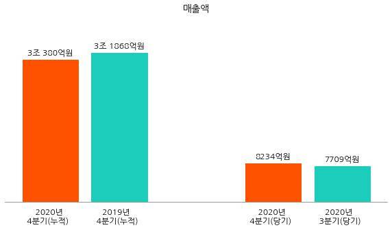 분기별 실적의 경우 2020년 4분기 매출액은 8234억원으로 동년 3분기 매출액 7709억원 대비 525억원(6.8%) 증가했다.