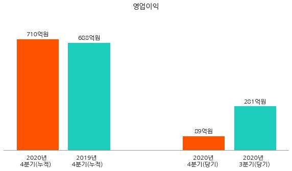 2020년 4분기 영업이익은 89억원으로 동년 3분기 영업이익 281억원 대비 192억원 감소했다.