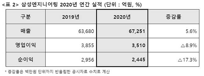 삼성엔지니어링은 지난해 연결 기준 실적이 매출 6조7251억원, 영업이익 3510억원, 당기순이익 2445억으로 잠정 집계됐다고 28일 공시했다.