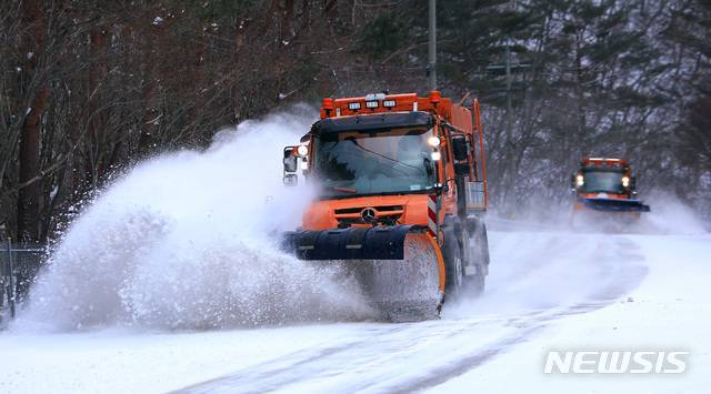 [인제=뉴시스]한윤식 기자 = 강원 일부지역에 대설주의보가 내려진 28일 오후 제설차량이 인제군 귀둔리 지방도로에 쌓인 눈을 치우고 있다. (사진=화천군청 제공) 2021.01.28. ysh@newsis.com