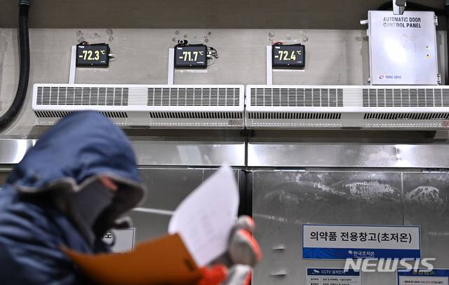 [평택=뉴시스] 김종택기자 = 정부가 신종 코로나바이러스 감염증(코로나19) 예방 백신 접종 세부 시행 계획을 발표한 28일 오후 경기도 평택시 오송면 한국초저온 물류센터에서 방한복을 입은 직원이 코로나19 백신 초저온 보관소를 점검하고 있다. 2021.01.28.