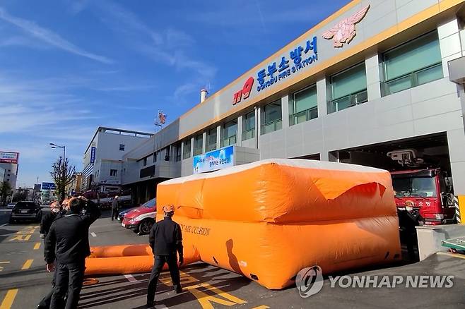 (광주=연합뉴스) 28일 오전 광주 동부소방서 청사 앞에서 에어매트 전개 훈련이 열리고 있다. 에어매트는 고층 건물에서 불이 났을 때 피난계단을 사용하지 못하면 건물 밖으로 뛰어내려 탈출하도록 설치하는 인명구조 장비이다. 동부소방서는 현장 대응능력을 높이고자 에어매트 설치와 조작 방법 습득에 중점을 두고 훈련을 진행했다. 2021.1.28 [광주 동부소방서 제공. 재판매 및 DB 금지]