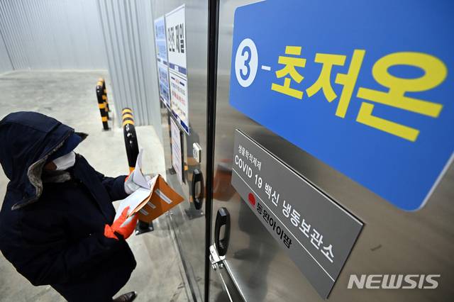 [평택=뉴시스] 김종택기자 = 정부가 신종 코로나바이러스 감염증(코로나19) 예방 백신 접종 세부 시행 계획을 발표한 28일 오후 경기도 평택시 오송면 한국초저온 물류센터에서 방한복을 입은 직원이 코로나19 백신 초저온 보관소를 점검하고 있다. 2021.01.28.