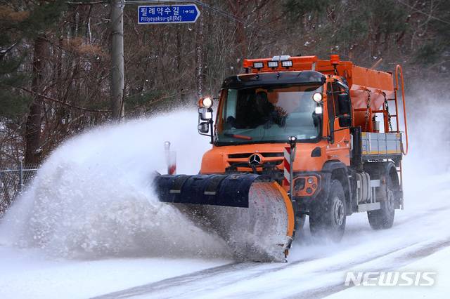[인제=뉴시스]한윤식 기자 = 강원 일부지역에 대설주의보가 내려진 28일 오후 제설차량이 인제군 귀둔리 지방도로에 쌓인 눈을 치우고 있다. (사진=화천군청 제공) 2021.01.28. ysh@newsis.com