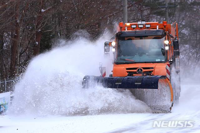[인제=뉴시스]한윤식 기자 = 강원 일부지역에 대설주의보가 내려진 28일 오후 제설차량이 인제군 귀둔리 지방도로에 쌓인 눈을 치우고 있다. (사진=화천군청 제공) 2021.01.28. ysh@newsis.com