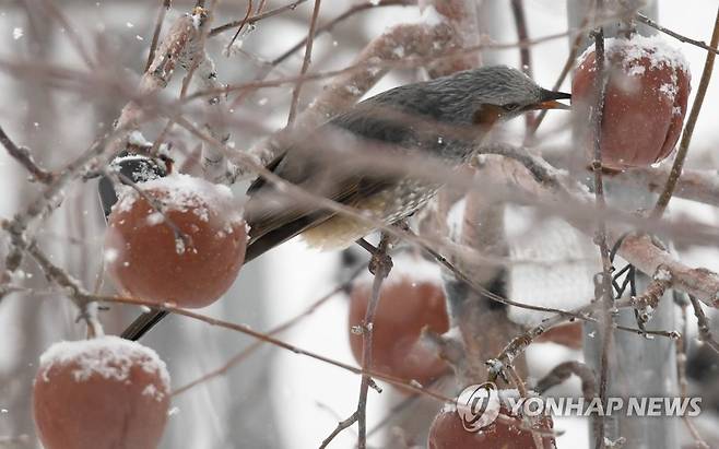 (서울=연합뉴스) 많은 눈이 내린 28일 경남 거창군 고제면 원봉계마을 어귀의 한 사과밭에서 직박구리 한 마리가 까치밥으로 남겨 둔 사과를 쪼아 먹고 있다. 2021.1.28