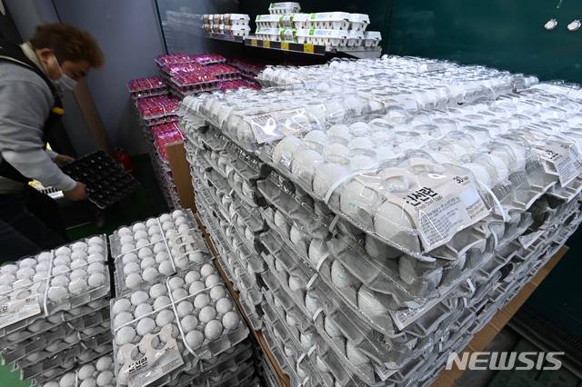[오산=뉴시스] 김종택기자 = 고병원성 조류 인플루엔자(AI) 확산으로 국내 계란 공급 부족 상황이 이어져 수입 계란이 시중에 유통된 28일 오후 경기도 오산시 한 마트에서 직원이 미국산 계란을 정리하고 있다. 2021.01.28.