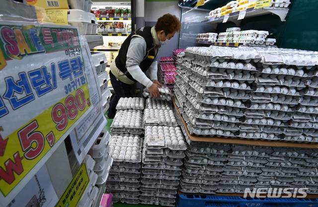 [오산=뉴시스] 김종택기자 = 고병원성 조류 인플루엔자(AI) 확산으로 국내 계란 공급 부족 상황이 이어져 수입 계란이 시중에 유통된 28일 오후 경기도 오산시 한 마트에서 직원이 미국산 계란을 정리하고 있다. 2021.01.28.