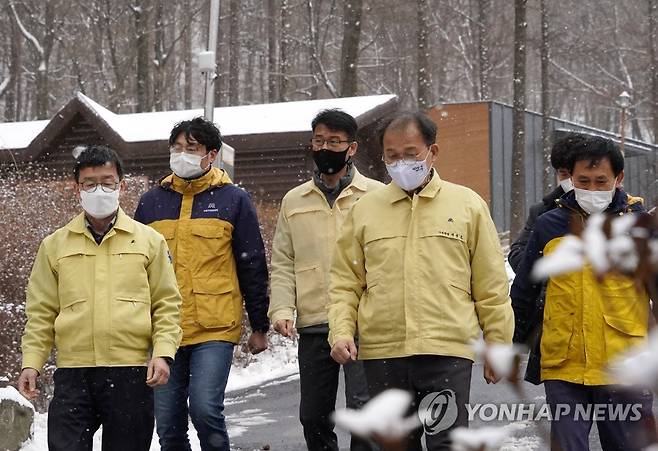 (서울=연합뉴스) 박종호 산림청장(앞줄 가운데)이 28일 충남 보령시 국립오서산자연휴양림에서 신종 코로나바이러스 감염증(코로나19) 예방을 위한 산림휴양 시설 방역 상태를 점검하고 있다. 2021.1.28