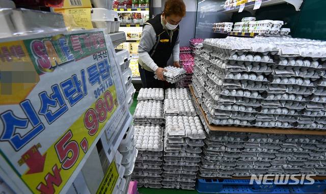 [오산=뉴시스] 김종택기자 = 고병원성 조류 인플루엔자(AI) 확산으로 국내 계란 공급 부족 상황이 이어져 수입 계란이 시중에 유통된 28일 오후 경기도 오산시 한 마트에서 직원이 미국산 계란을 정리하고 있다. 2021.01.28.