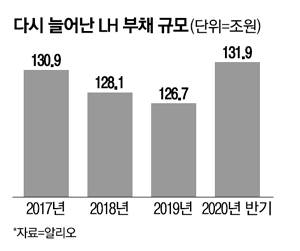 28일 업계에 따르면 LH는 지난해 기준 부채가 132조원으로 추산된다. 2015년 이후 매년 부채 규모를 2조~3조원씩 줄여왔지만 지난해 다시 5조원 가까이 늘어난 것이다.
