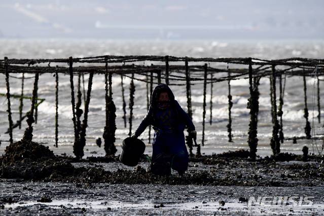 [남해=뉴시스] 차용현 기자 = 전국 곳곳에 강풍 주의보가 내려진 28일 오후 경남 남해군 이동면 인근 갯벌에서 한 어민이 굴을 캐고 있다. 2021.01.28. con@newsis.com
