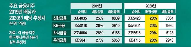 이들 금융지주가 금융위가 권고한 배당성향 ‘20% 이하’를 맞추려면 올해는 배당금을 5분의 1 이상 줄여야 한다. 은행지주들의 공시와 한국투자증권 추정치를 감안하면 지난해 신한금융은 3조5423억원, KB금융 3조4904억원, 하나금융 2조5616억원, 우리금융 1조4715억원의 순이익을 올렸을 것으로 전망된다.