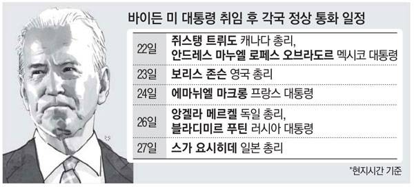 28일 스가 요시히데 일본 총리가 바이든 대통령과 통화하면서 우리 정부로선 부담이 더욱 커졌다. 청와대 관계자는 이날 "조만간 통화가 이뤄질 것"이라고 전했다. 앞서 지난 20일 취임 이후 바이든 대통령은 캐나다, 멕시코 등 북미·중미 정상에 이어 영국, 독일, 프랑스 등 유럽 주요국과 통화했고 일본을 포함한 아시아 국가들과 통화를 진행하고 있다. 지난해 11월 당선 때 각국에서 축하 전화를 받는 순서도 북미·중미, 유럽, 아시아 순으로 이뤄지면서 러시아를 제외한 미국의 동맹 '우선순위'도 드러나고 있다는 분석이다.