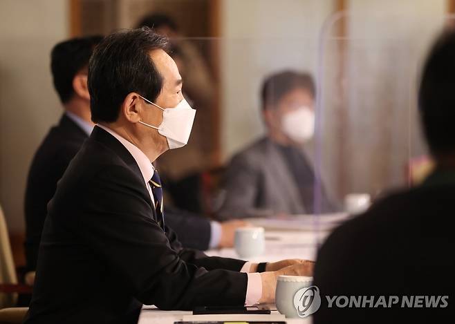 (서울=연합뉴스) 류영석 기자 = 정세균 국무총리가 28일 서울 삼청동 총리공관에서 '코로나19 영업 손실보상, 제도화 방안'이라는 주제로 열린 제34차 목요대화에서 발언하고 있다. 2021.1.28