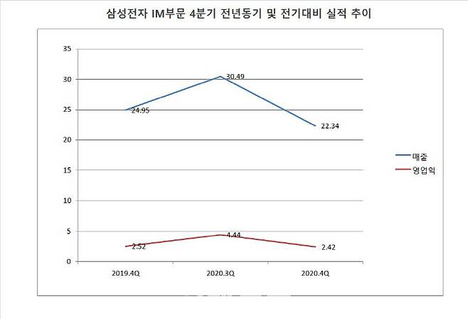 삼성 스마트폰 사업은 지난해 연간 기준으로는 코로나19 사태 속에서도 선전했으나, 4분기는 ‘아이폰12 효과’로 부진을 면치 못했다. 매출과 영업이익 모두 전년동기대비 감소했으며, 스마트폰 판매량과 평균판매단가 역시 하락했다.
