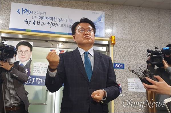 | ▲ 2020년 4월 24일 검찰이 불법 당원명부 유출 사건과 관련, 더불어민주당 황운하(대전 중구) 국회의원 당선인의 선거 사무소를 압수수색했다. 이에 황 당선인이 선거사무소 앞에서 자신과는 무관한 사건이라며 입장을 밝히고 있다. |