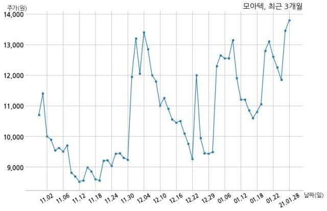 한편, 모아텍은 장 마감 이후 해당 기업공시를 발표했으며 오늘 종가가 13,800원, 거래량은 2,882,567주로, 직전 거래일 대비 350원(+2.6%) 상승했다.