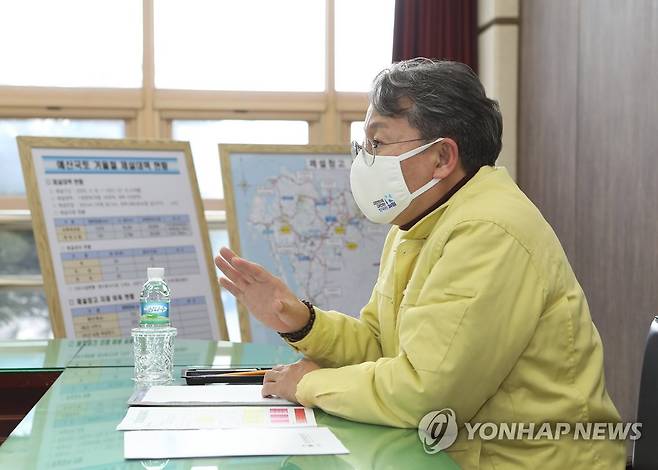 (서울=연합뉴스) 손명수 국토교통부 제2차관이 28일 충남 예산국토관리사무소를 방문해 관계자들과 간담회를 하고 있다. 2021.1.28