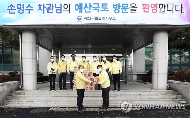 (서울=연합뉴스) 손명수 국토교통부 제2차관이 28일 충남 예산국토관리사무소를 방문해 현장관계자들을 점검한 뒤 기념촬영을 하고 있다. 2021.1.28