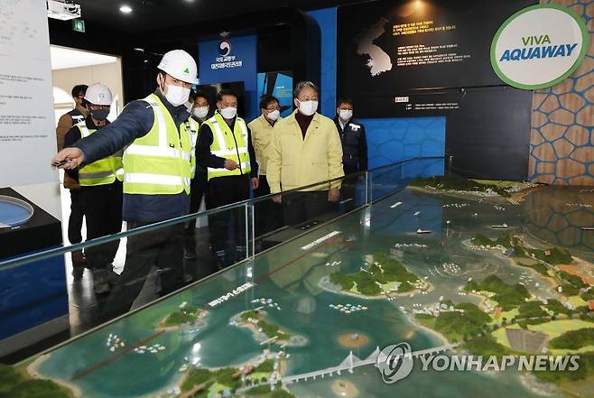 (서울=연합뉴스) 손명수 국토교통부 제2차관이 28일 충남 예산 '보령-태안1 국도건설현장'을 방문해 사업현황을 보고 받고 있다. 2021.1.28