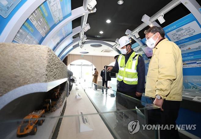 (서울=연합뉴스) 손명수 국토교통부 제2차관이 28일 충남 예산 '보령-태안1 국도건설현장'을 방문해 사업현황을 보고 받고 있다. 2021.1.28