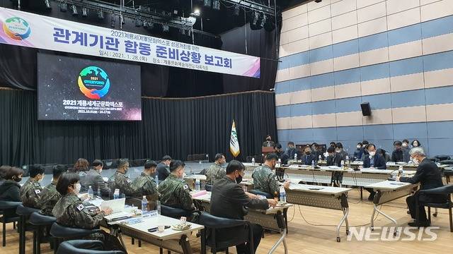 [홍성=뉴시스]유효상 기자 = 2021계룡세계軍문화엑스포가 오는 10월 1~17일까지 계룡시 활주로 일원에서 개최되는 가운데 조직위원회 주관으로 28일 계룡문화예술의전당 다목적홀에서 ‘2021계룡세계군문화엑스포 관계기관 합동 준비상황 보고회’가 열리고 있다. (사진=계룡세계군문화엑스포 조직위 제공) 2021.01.28 photo@newsis.com